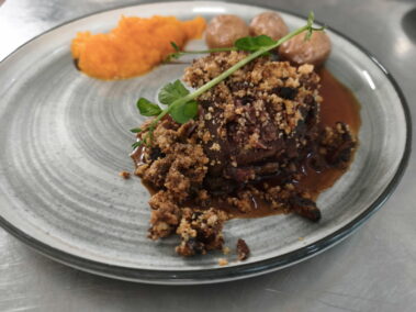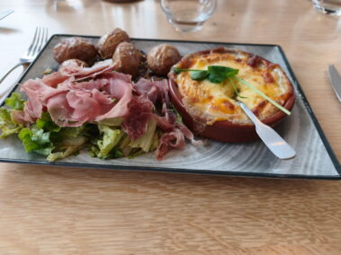 Steak, galette de pomme de terre, chèvre rôti au miel, bacon frit