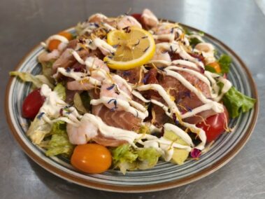 Saumon fumé maison, crevettes, avocat, crème d’aneth citronnée, citron